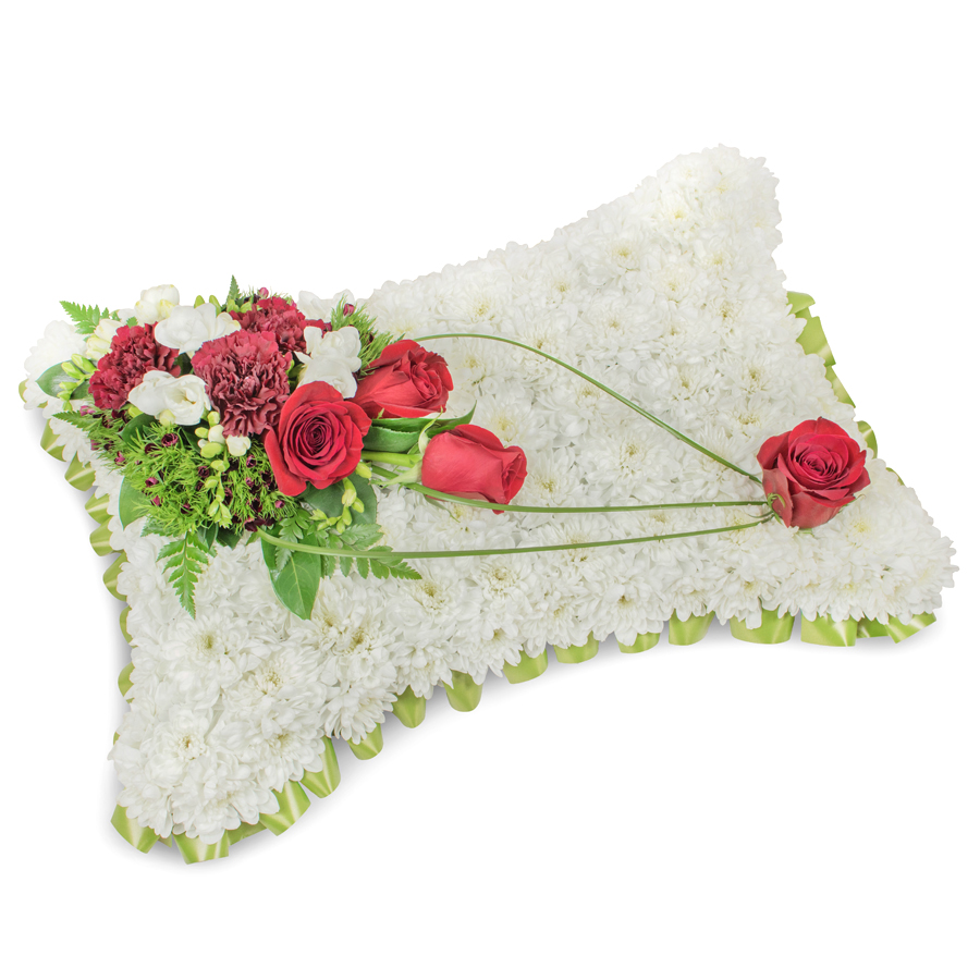 Express your condolences with our beautifully crafted sympathy bouquet, featuring a harmonious mix of white chrysanthemums, vibrant red roses, and sweet freesias. Accented with dark red carnations, dianthus, and bear grass, this arrangement is a unique and elegant way to show your support.