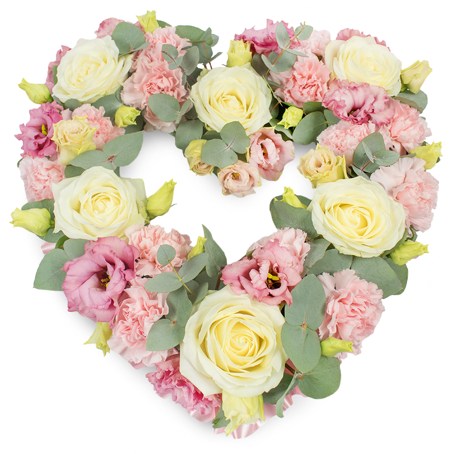 Embrace the art of remembrance with this meticulously arranged bouquet. Featuring sumptuous white roses, charming pink carnations, and graceful pink lisianthus, each blossom is hand-selected for its uncompromising quality and freshness. The addition of lush eucalyptus leaves provides a calming balance, setting the stage for a tribute filled with elegance and warmth.